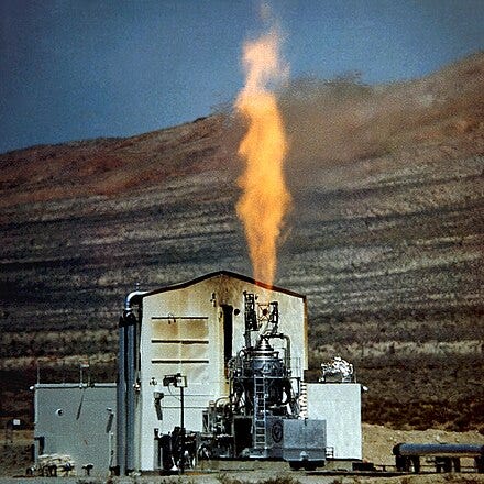 The 1960s were a different time. I was reminded of that the other day when re-reading a portion of James Mahaffey’s thoroughly enjoyable book Atomic Adventures. Chapter 5 of that work recounts the tale of Project Rover, and the KIWI rocket engine, which used hydrogen as a fuel and a nuclear fission reactor to build and test an engine that would get a craft to Mars much faster than a chemical rocket. The device was tested, as can be seen in the image.