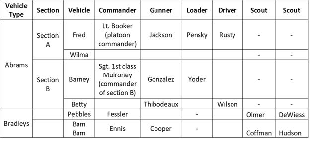 “Lieutenant Booker.” Mulroney approached, the four dismounted scouts from the two Bradleys in tow. “Olmer, DeWiess, Coffman, and Hudson, as requested, sir.” Mulroney stepped aside and swept a hand at the scouts, equipped with helmets and carbines. The scouts came to attention, and saluted.