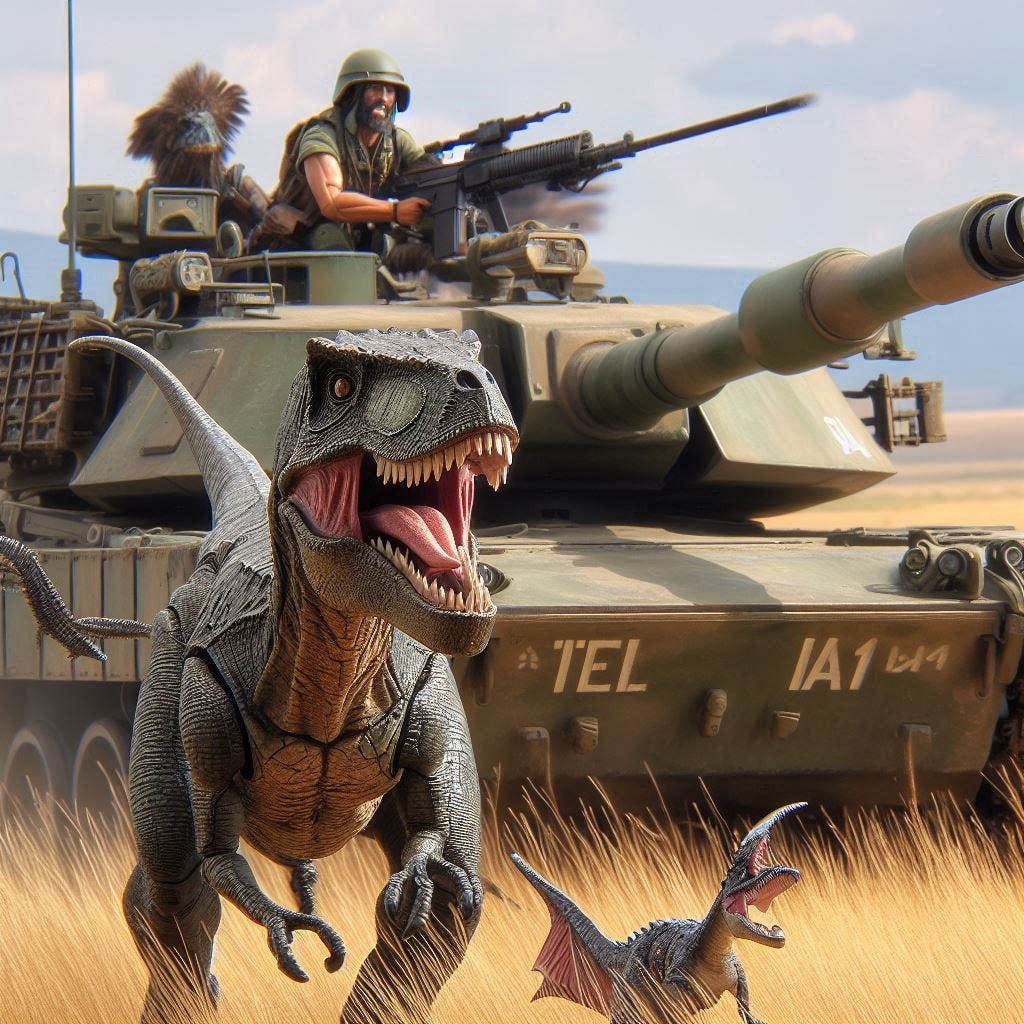 You probably received re-sends of the 1st 2 parts of this story yesterday. Sorry about that. I was re-organizing my Substack page to gather serialized fiction into one section, and didn’t notice that a switch needed to be clicked. ==> Re-sends. In compensation, here’s part 3, a day earlier than normal. I hope you enjoy it as much as I am writing this tale. I mean, tanks & dinosaurs. What’s not to like?
