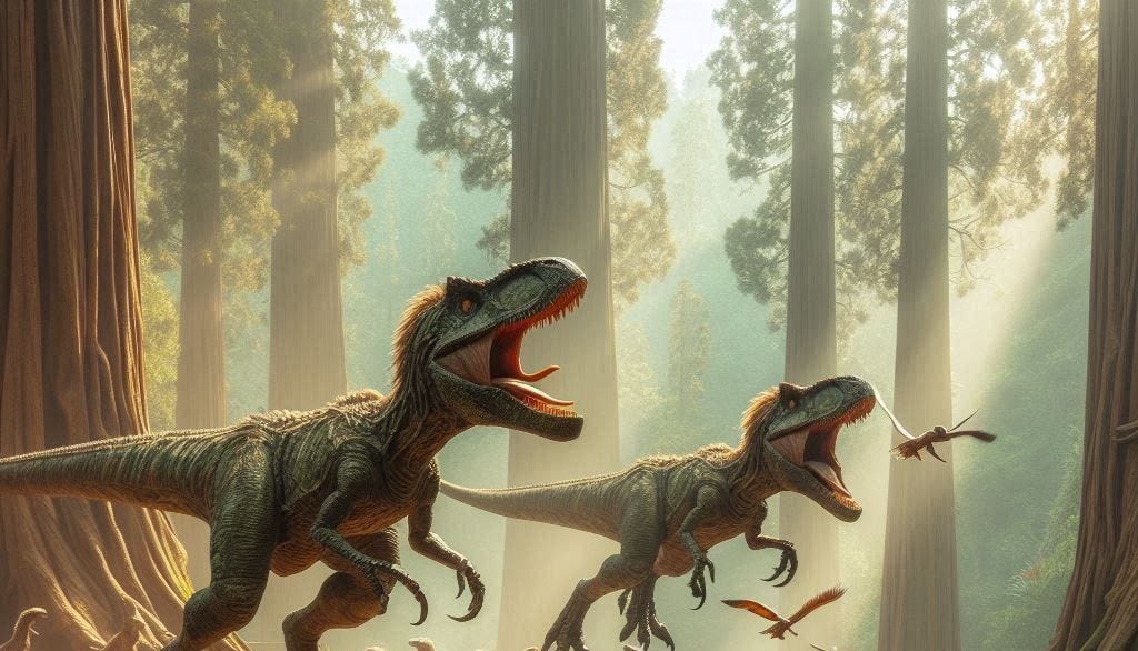 A day break glow painted the sky above the gloom of the trees. The platform was still cloaked in shadow, but there was enough light to see by. And a savage sight it was. A pair of velociraptors stalked forward at the end of the platform nearest the bridge to the cliff, ferocious jaws agape and dreadful claws tapping on the bare wood. Their tails whipped back and forth as the heads snarled and snapped.